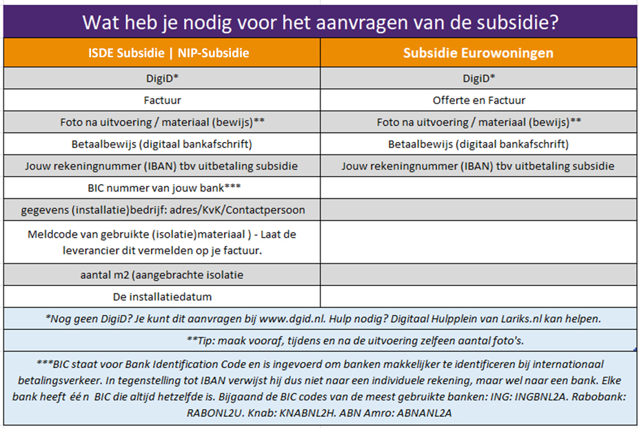 Voor het aanvragen van de ISDE subsidie, Subsidie Eurowoningen of NIP subsidie is een goede voorbereiding het halve werk. Zorg dat je de offerte, factuur, betaalbewijs en foto van de uitvoering bij de hand hebt.